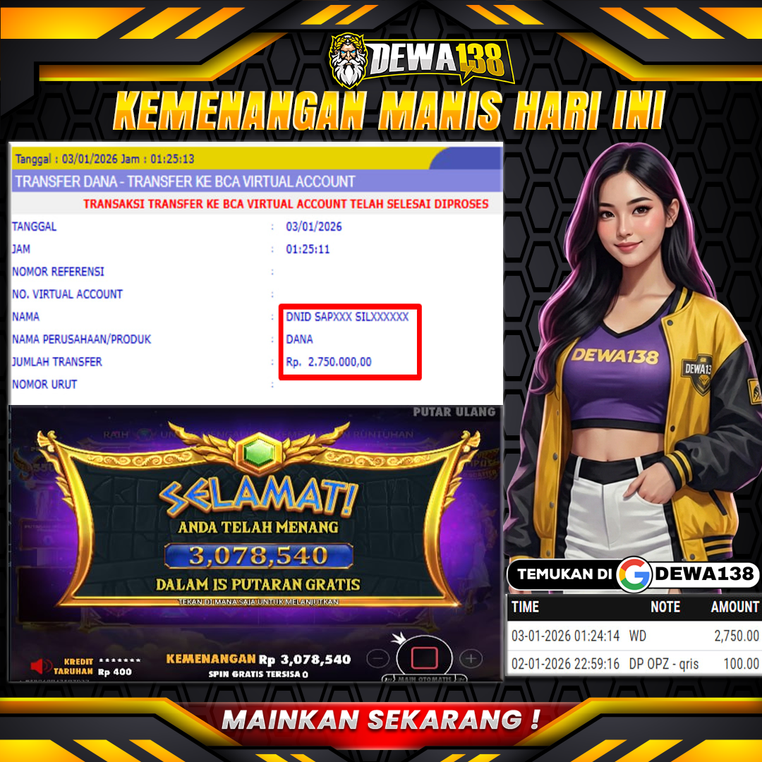 Gabung bersama DEWA138 dan Dapatkan kesempatan jackpot sensasional dalam 15 menit seperti bukti banner ini bukan sekedar janji hanya Depo 100k Withdraw 2,7+ juta hari ini.